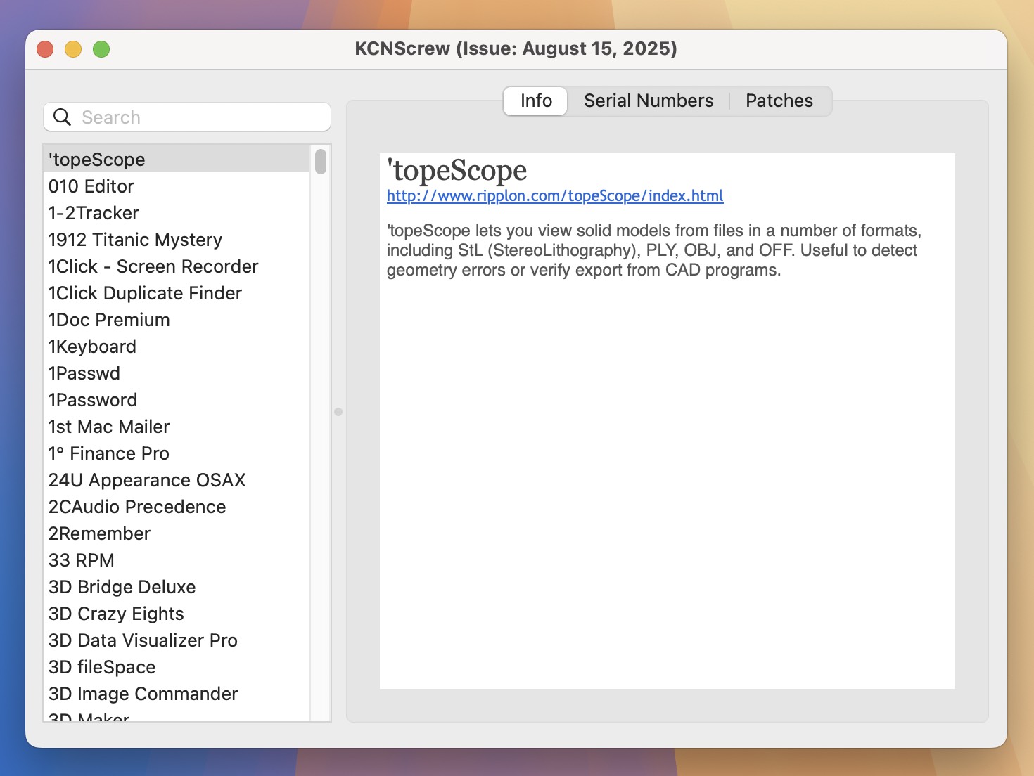 KCNcrew Pack for mac内置强大的序列号数据库。软件包含数千款软件序列号,基本上大多数常用软件你都可以找到相应的序列号。KCNcrew Pack for mac的数据库还在不断的更新中,每个月15号会更新一批新的序列号,此次更新为最新版9月份序列号补充。
